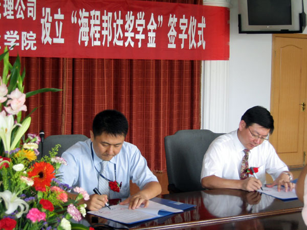 在第二十个教师节来临之际,在货运代理行业享有盛誉的海程邦达国际货运代理有限公司与买球体育平台举行了设立“海程邦达奖学金”的签约仪式。这是该公司继2002年在中国海洋大学设立海程邦达奖学金后又一次出资在高校设立奖学金,以资鼓励品学兼优及文体、社会活动等方面表现优秀的学生。为了进一步发挥海程邦达国际货运代理有限公司和买球体育平台双方的优势,加速培养适应国际货运代理业务所急需的应用技术人才,双方还签订了合作办学协议,为学院提供实训教学基地。海程邦达国际货运代理有限公司此举实现了校企互动,促进了产、学、研结合。