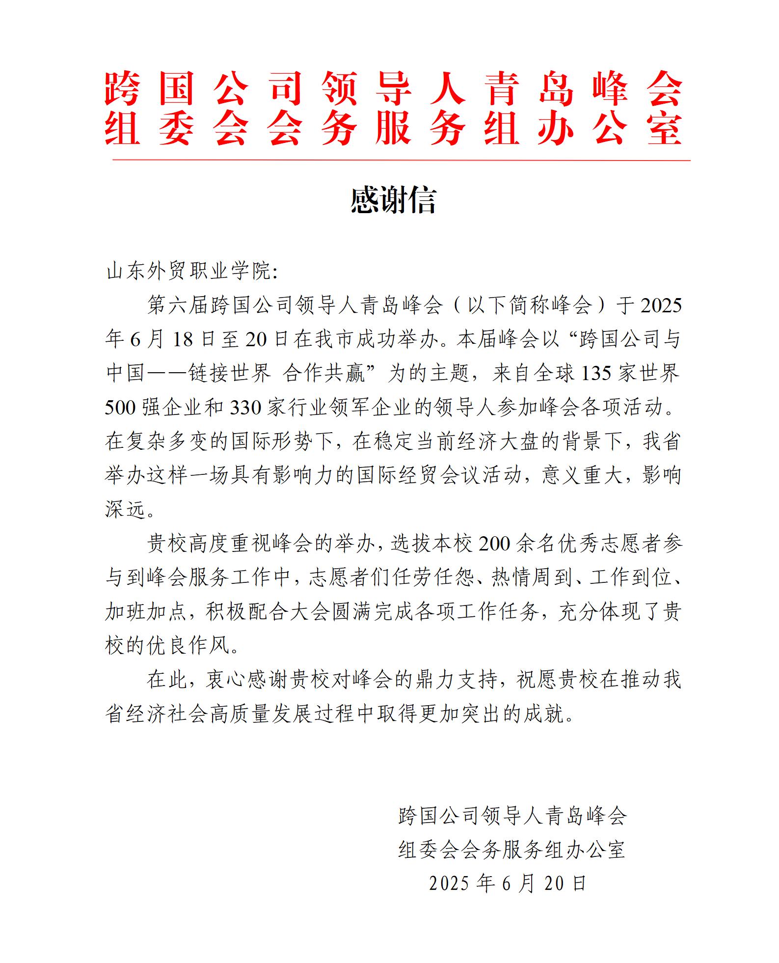6月20日,由山东省人民政府与商务部共同主办的第六届跨国公司领导人青岛峰会圆满闭幕。本届峰会以“跨国公司与中国—链接世界 合作共赢”为主题,吸引了来自全球六个大洲43个国家和地区465家跨国公司的570位嘉宾参会。本次峰会,学院共派出241名志愿者,分别在嘉宾接送、会务保障、媒体宣传和午间荟等大小三十余个岗位上开展志愿服务工作。