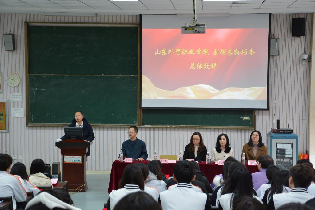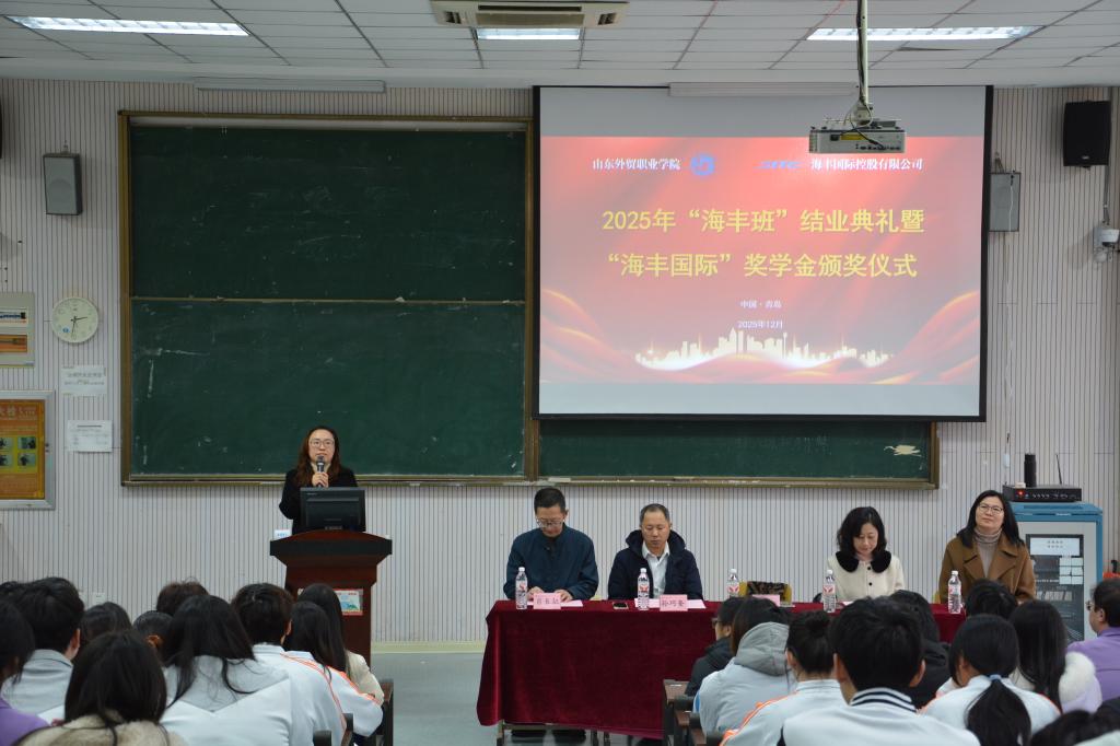 12月18日,第四届“海丰班”结业典礼暨“海丰国际”奖学金颁奖仪式在买球体育平台北校区举行。新海丰物流有限公司青岛分公司副总经理孙文丽、学院副院长孙巧奎、学生工作处副处长江晓畅、国际运输与物流系党总支书记肖长征、系主任马文君,以及“海丰班”全体学员和“海丰国际”奖学金获奖学生共同参加本次活动。