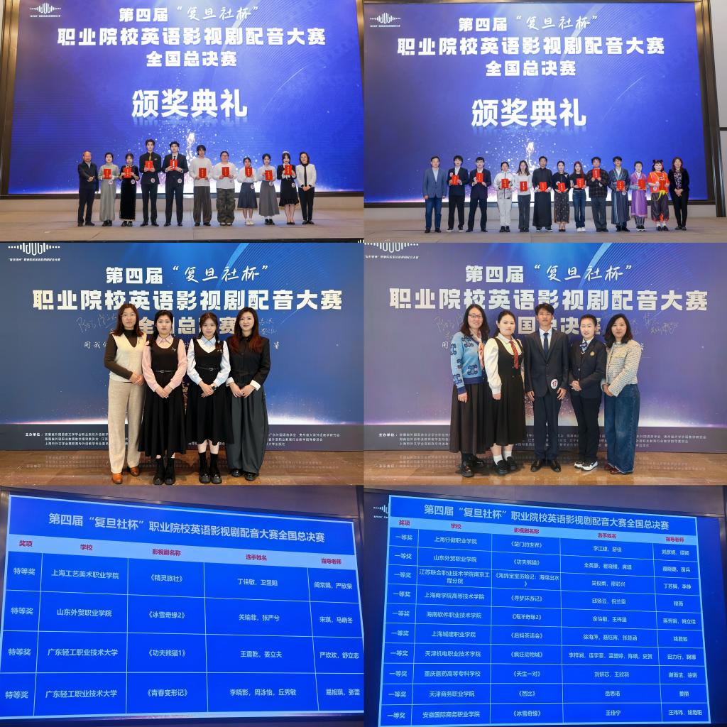 4月11日,第四届“复旦社杯”职业院校英语影视剧配音大赛全国决赛在青岛举行。我院学生24旅游2班关瑜菲、24国贸7班张严兮获特等奖,24关务1班全英豪、席墙和25国贸14班崔晓穜获一等奖。