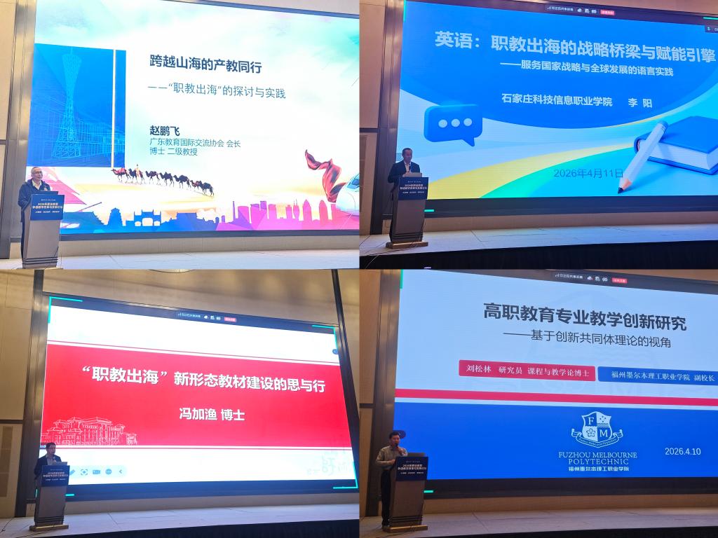 研讨会以“AI赋能、校企合作、职教出海”为主题。来自全国教育界的领导、行业专家与院校一线教师齐聚一堂,共话职业教育国际化发展新路径,探索英语教学创新新模式。刘珉介绍了我院办学特色、外语教学的突出成果,以及落实国家职教出海战略所取得的成就。她强调职业教育应紧跟国家对外开放与产业升级步伐,精准对接国际化人才需求,为职教出海搭建稳固的语言桥梁,推动产教融合与人才培养高质量发展。山东省外语职业教育行业教学指导委员会副主任、秘书长崔卫指出,在职教高质量国际化发展的关键之年,山东作为职教改革高地,应借助本次研讨会凝聚共识,强化外语教学的重要支撑作用,助力职教出海。会上,广东教育国际交流协会会长赵鹏飞《跨越山海的产教同行——“职教出海”的探讨与实践》以中国-赞比亚职业技术学院为案例,梳理了我国职业教育国际化发展脉络;石家庄科技信息职业学院副校长李阳《英语:职教出海的战略桥梁与赋能引擎——服务国家战略与全球发展的语言实践》阐释了英语作为战略桥梁与赋能引擎的重要作用;陕西师范大学教授、教育部职业教育基本专家库专家冯加渔《“职教出海”新形态教材的思与行》和福州墨尔本理工职业学院副校长刘松林《高职教育专业教学创新研究》分别从新形态教材建设、专业教学创新团队研究等方面提供理论与实践支撑。