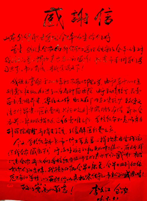 2005年7月,经济管理系04级财会2班的李艇同学,被确诊为淋巴肿瘤,住进了山东省肿瘤医院接受治疗。
