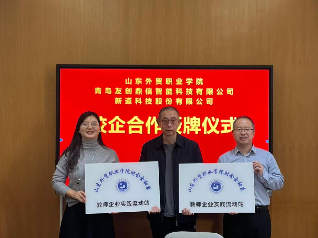 近日,青岛友创鼎信智能科技有限公司总经理党金泉、新道科技股份有限公司山东分公司校企合作总监高文到访我系,就深化产教融合、共建教师实践流动站及实训基地进行合作。财会金融系主任卢吉强、副主任徐烨、唐智昊参加会议,双方正式签署校企战略合作协议及教师企业实践流动站挂牌仪式。