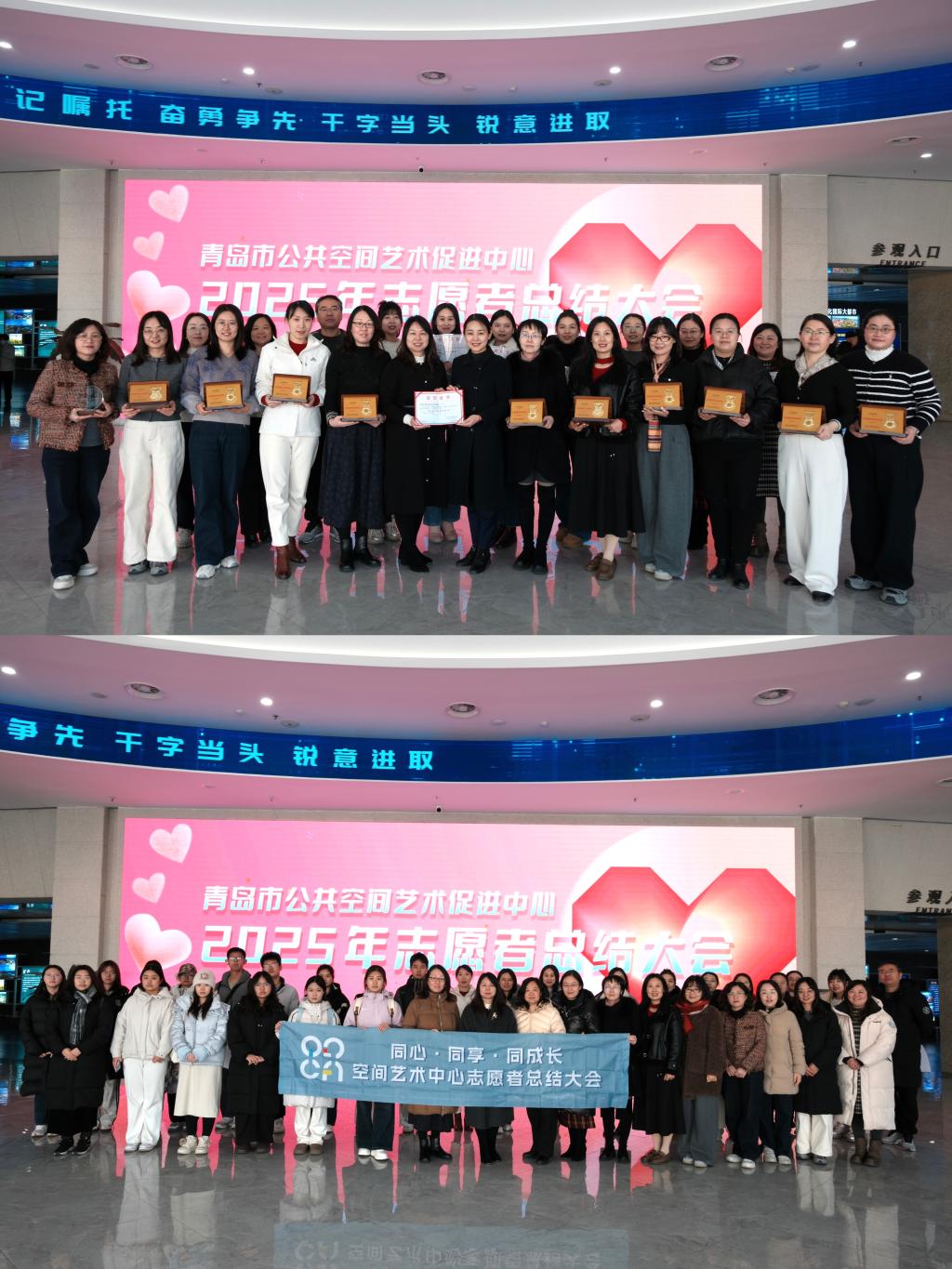 1月11日上午,青岛市公共空间艺术促进中心在青岛城市展览馆隆重举办“同心·同想·同成长”2025年志愿者总结大会。公共英语部志愿者团队受邀参会。岛城各高校志愿者团队及社会志愿者代表共同参与。